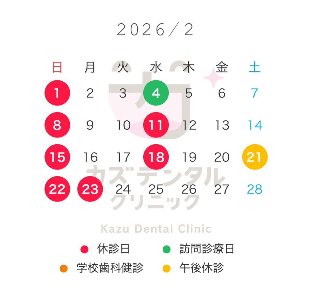 2月休診日のお知らせ 2026.01.29 1日(日)、8日(日)、11日(水)、15日(日)、18日(水)、22日(日)、23日(月)は休診日となります。 21日(土)院長所用のため午前中のみの診療とさせていただきます。 4日(水)は訪問診療のみとなります。